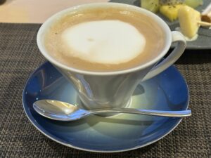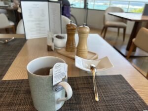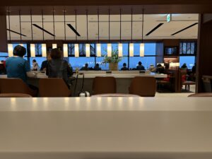 ラウンジ内はゆったり寛げるテーブルと椅子が並びます